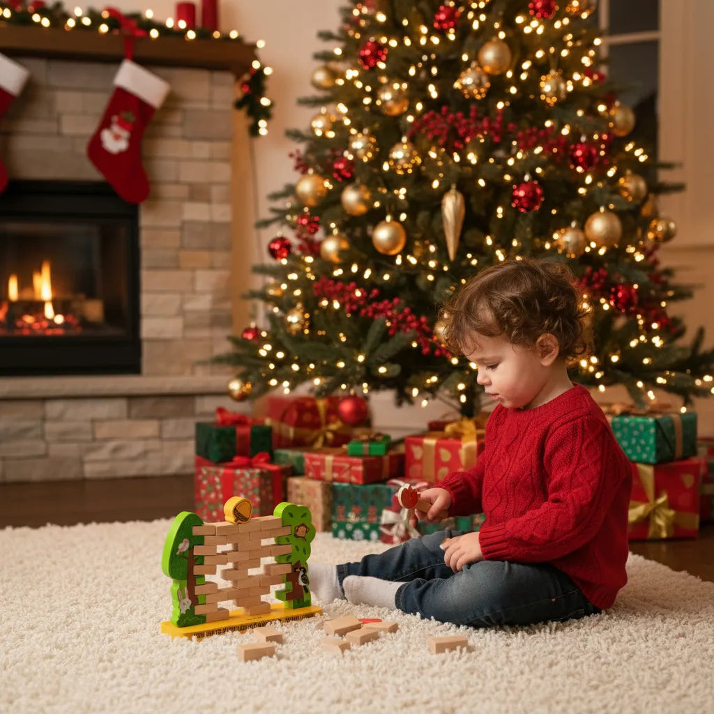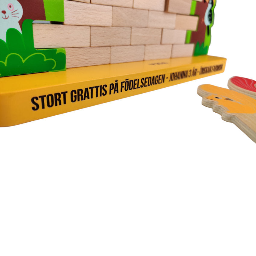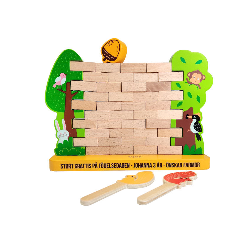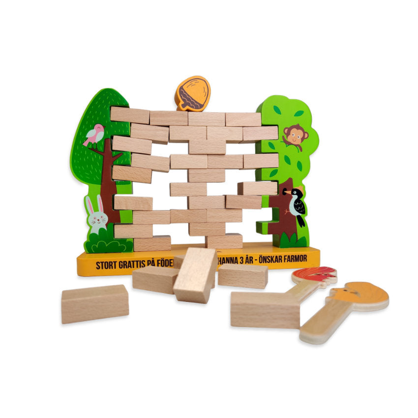 Ekorrspelet där klossar ska petas ut ur väggen utan att den rasar.
