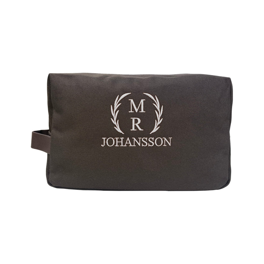Toalettväskan levereras med brodyr i form av personlig text och en krans. Inuti kransen broderas 1–2 tecken och den personliga texten har plats för maximalt 15 tecken. All text skrivs med versaler i en rak stil vilket skapar ett klassiskt uttryck. Brodyren görs med en svart, vit, rosa eller ljusbrun tråd för att passa din personlighet och placeras mitt på necessären.