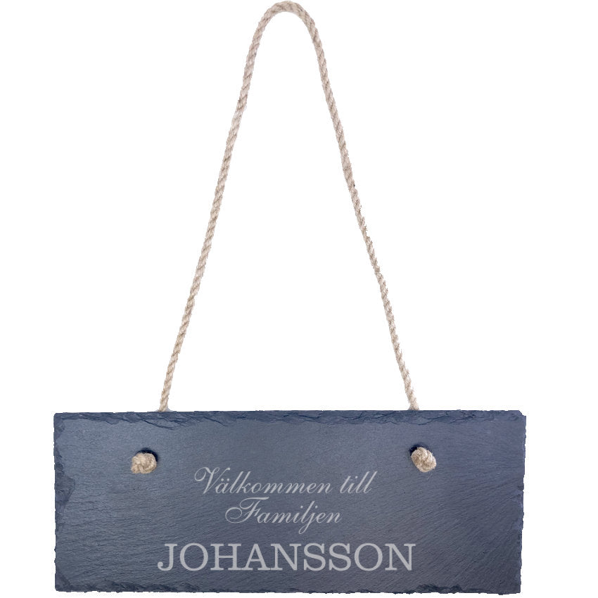Snygg dörrskylt i skiffer med tillhörande repsnöre för upphängning.