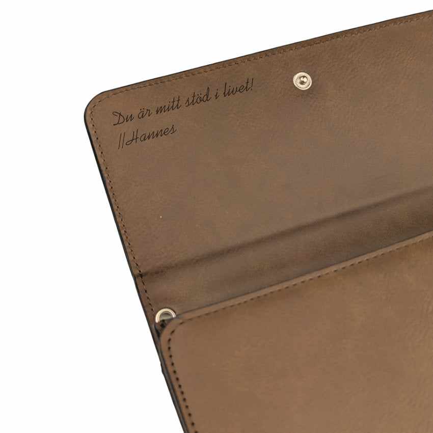 En mycket praktisk, medelstor damplånbok där en personlig gravyr i form av tre rader text i minimalistisk stil sätter prägel. Gravyren placeras diskret på insidan locket.