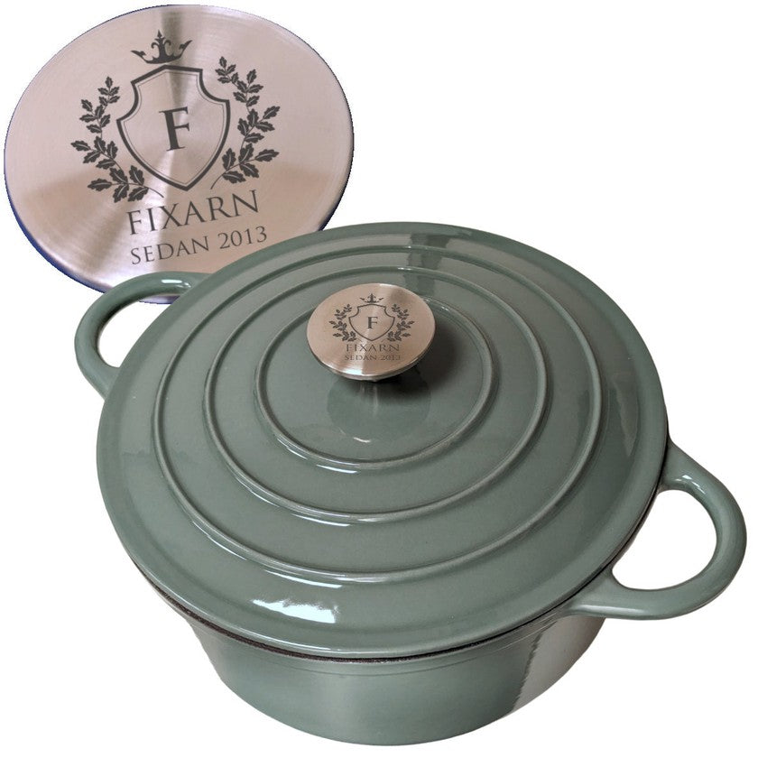 En personlig gravyr på lockets knopp gör grytan till en unik detalj i köket eller en minnesvärd present till bröllop, inflyttning eller födelsedag.