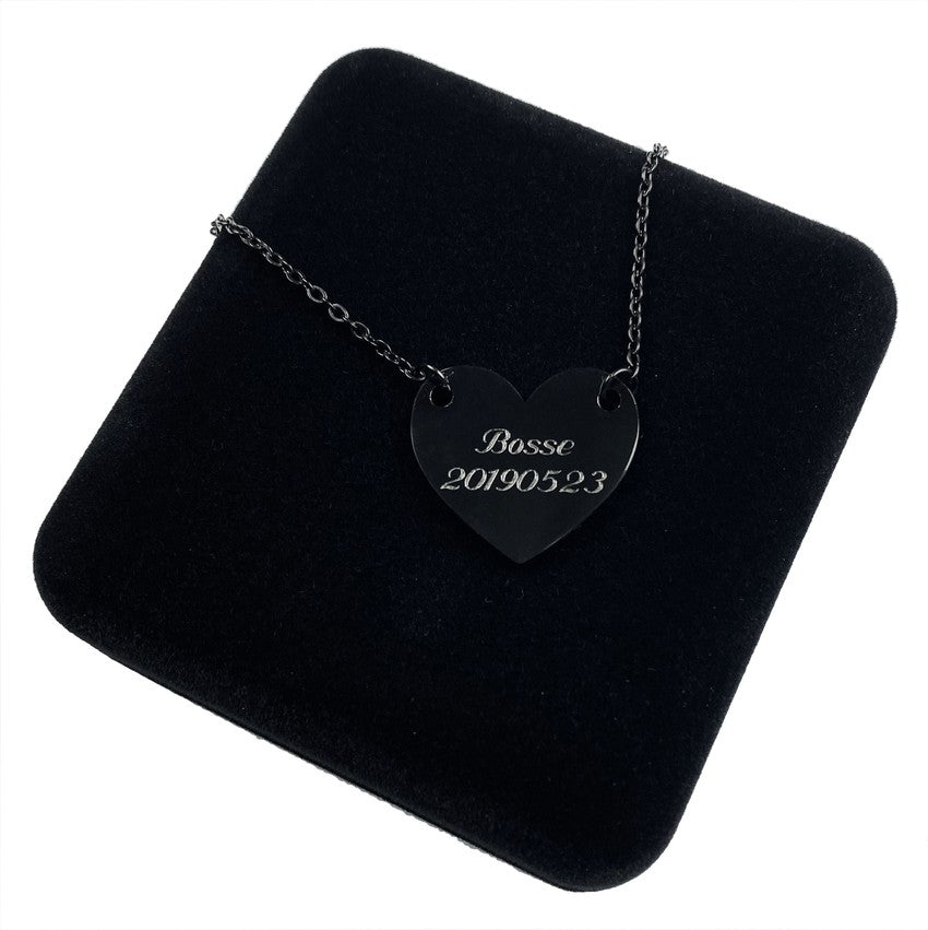 Halsband av svartpläterat rostfritt stål, med hänge format som ett hjärta. Hjärtat mäter 20 x 10 x 1,3 mm och kedjan 520 mm.