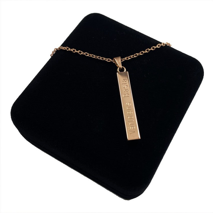 Halsband med kedja och stavformat hänge. Smycket är av rostfritt stål men pläterat med roséguld. Staven mäter 29,5 x 5 x 5 mm och kedjans längd är 50 cm.