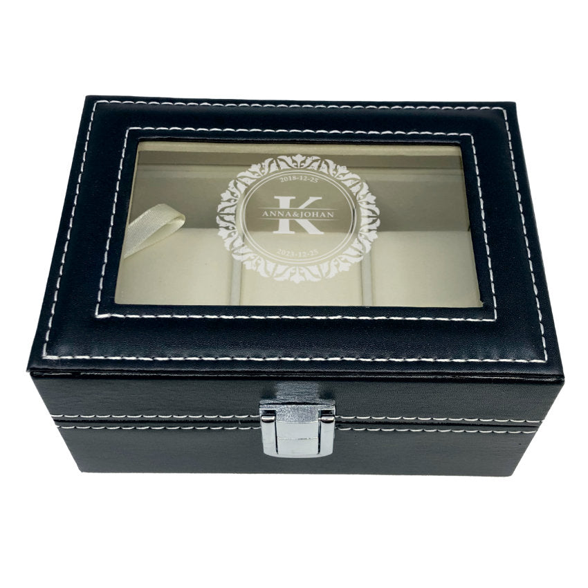 Denna klockförvaring höjer sig över det vanliga med möjligheten till personlig gravyr på det eleganta glaslocket. Här kan du låta din kreativitet blomstra genom att gravera ditt namn, initialer eller ett minnesvärt meddelande. Det blir inte bara en klockbox; det blir en personlig skatt som speglar din unika stil.