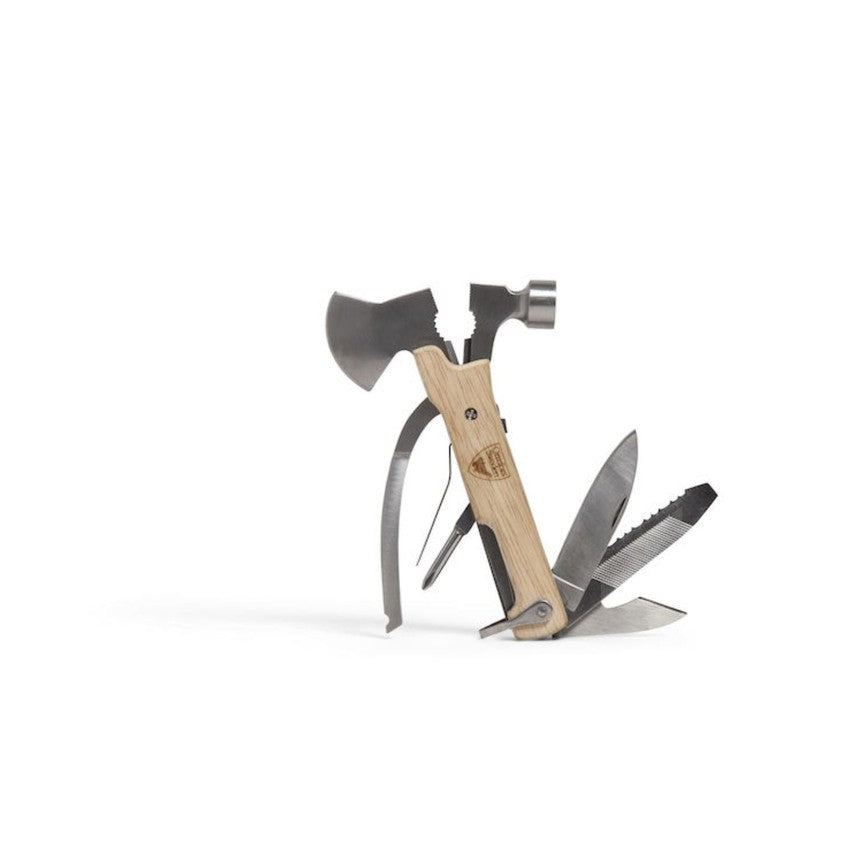 Praktiskt multiverktyg från Orrefors Hunting. Verktyget är utrustat med hammare, yxa, nagelfil, avbitare, tång, olika knivar, olika skruvmejslar samt en burköppnare – allt i ett. Handtaget är gjort av ljust trä och verktyget är perfekt att ha med i ryggsäcken på jakt eller vid andra friluftsaktiviteter.