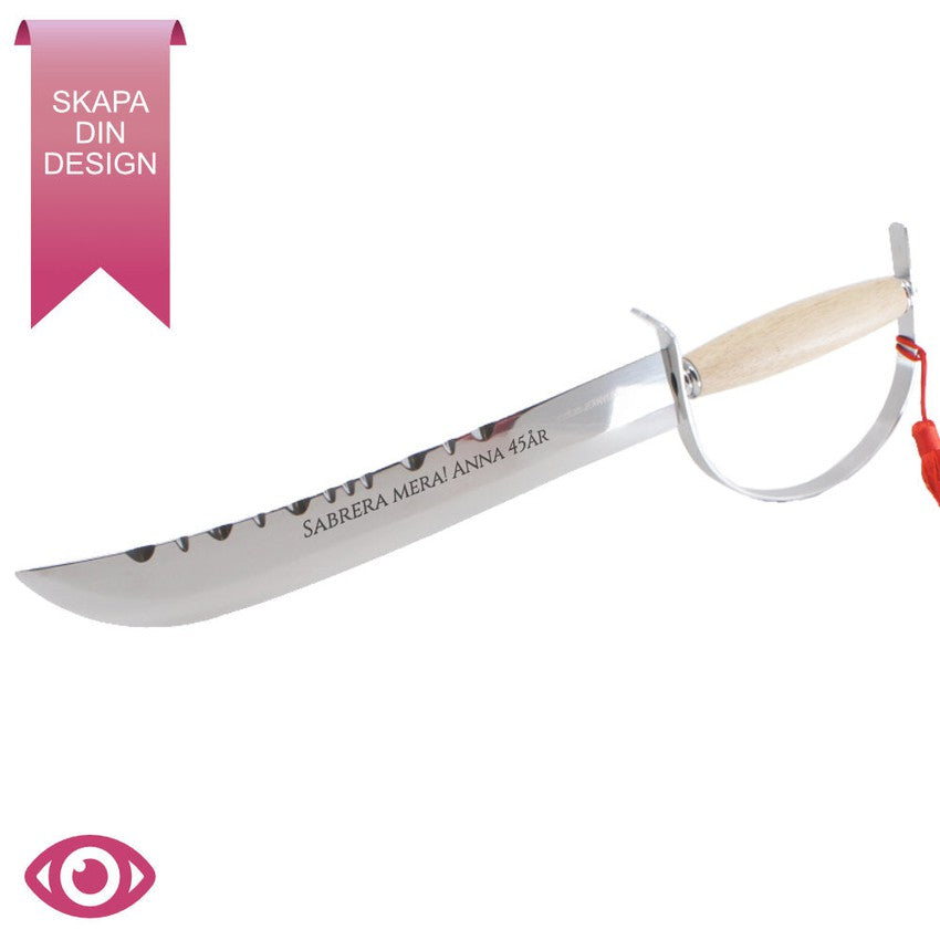 Gör din sabreringssabel unik med en personlig gravyr. Du kan välja en textrad med upp till 35 tecken och se resultatet direkt i webbläsaren. Välj bland fyra olika typsnitt för att sätta din egen prägel på denna eleganta sabel. Gravyren utförs med precision genom laser och får en distinkt svart/mörkgrå finish, vilket ger sabeln en sofistikerad touch.