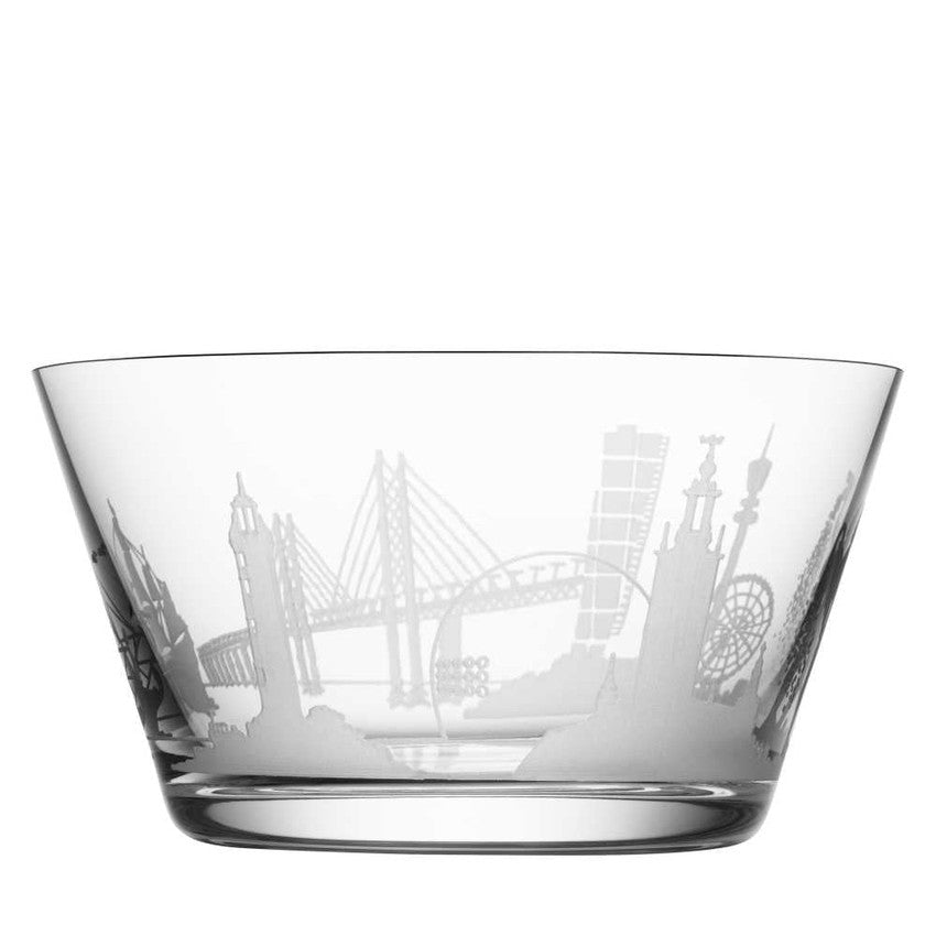 Denna Orrefors Cities glasskål pryds av etsade siluetter av Sveriges tre största städer: Stockholm, Göteborg och Malmö.