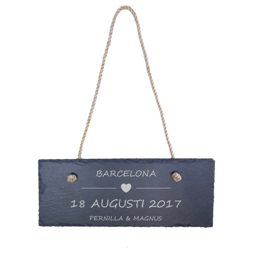 Skylt i grå skiffer med tillhörande repsnöre för upphängning.