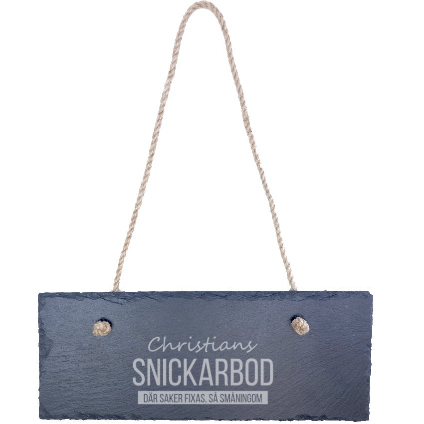 Snygg dörrskylt i skiffer med tillhörande repsnöre för upphängning.