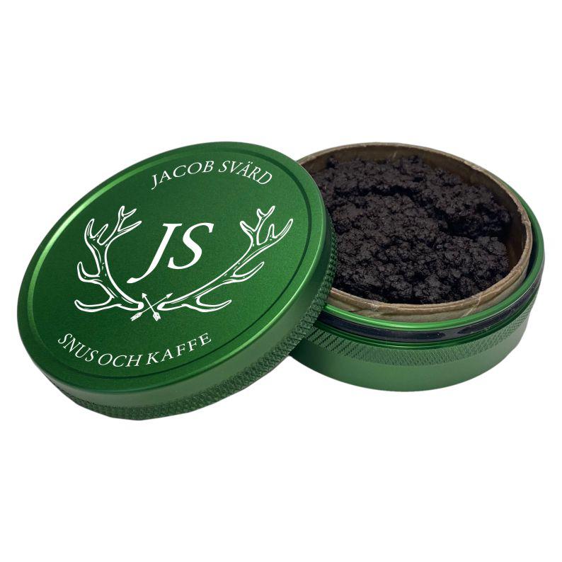 Snusdosa tillverkad av aluminium, som finns att tillgå i färgerna grön, blått och svart.